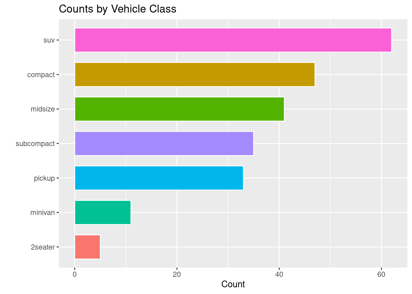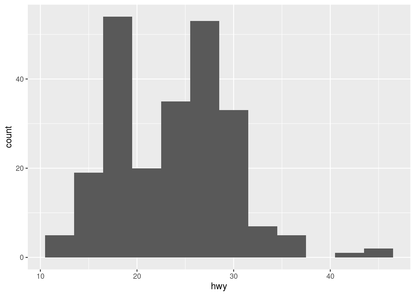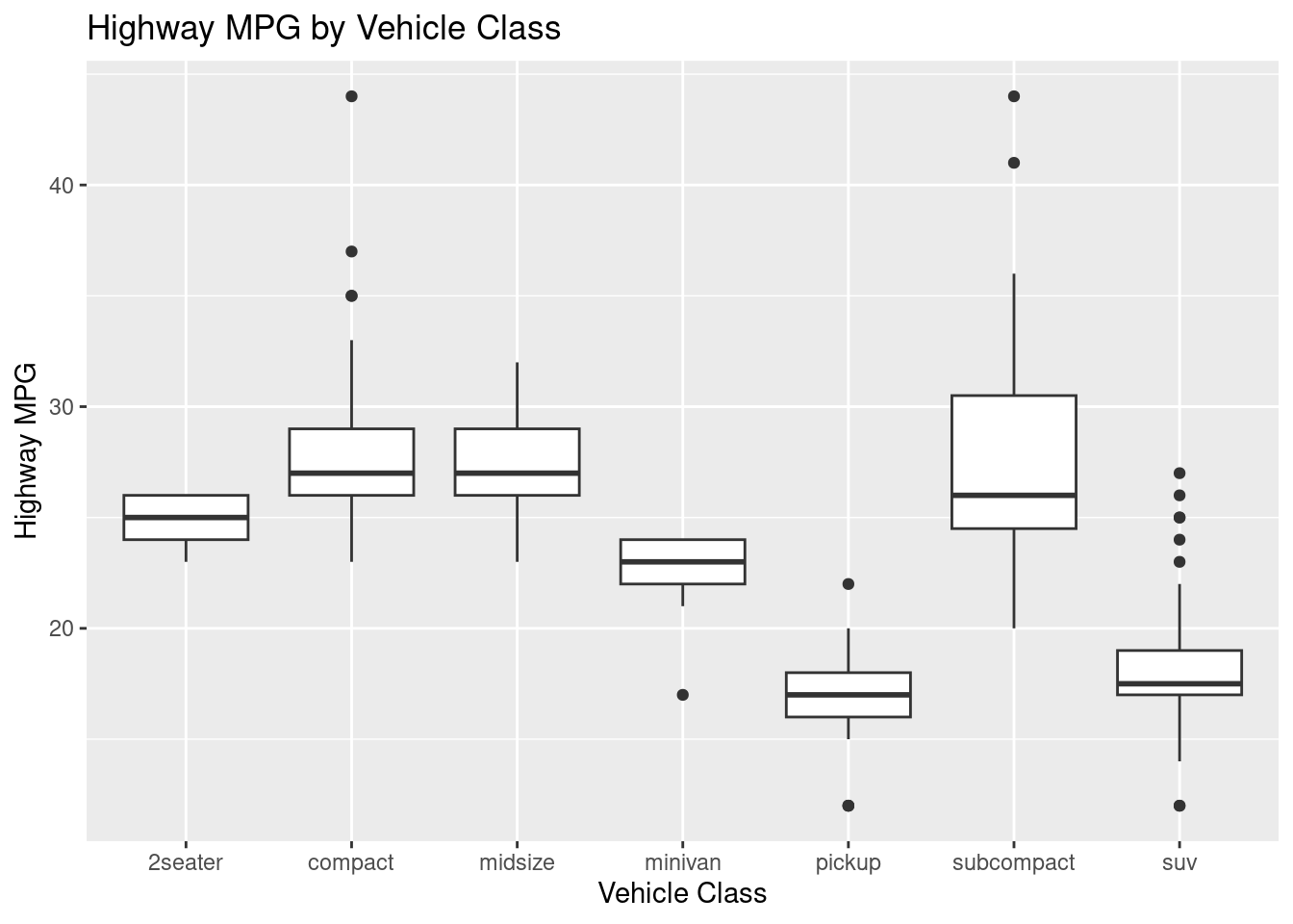 # BASICggplot(mpg, aes(x = class, y = hwy)) +geom_boxplot() +labs(title ="Highway MPG by Vehicle Class", x ="Vehicle Class", y ="Highway MPG")