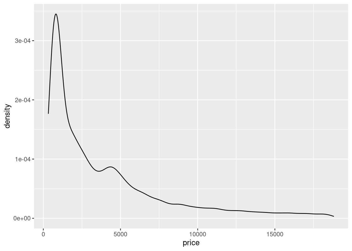 Density plots still show the distribution of data, but instead of doing it in bins like a histogram, accomplish this through an outline. The geometry for a density plot is geom_density().