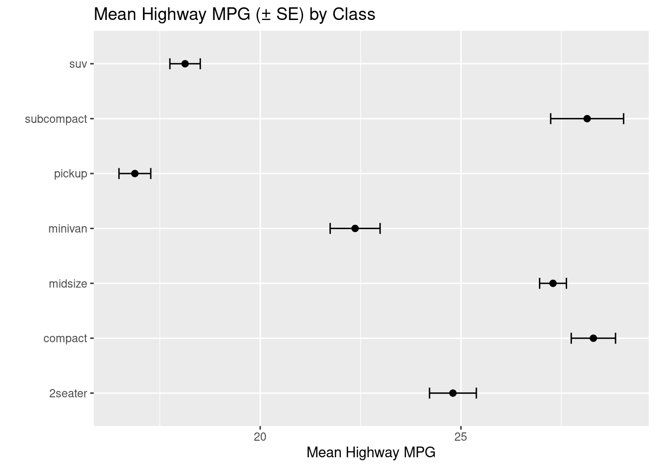 # Points + error bars (plot error bars first so points sit on top)ggplot(summ_hwy, aes(class, mean_hwy)) +geom_errorbar(aes(ymin = mean_hwy - se_hwy, ymax = mean_hwy + se_hwy), width =0.2) +geom_point(size =2) +coord_flip() +labs(title ="Mean Highway MPG (± SE) by Class", x ="", y ="Mean Highway MPG")