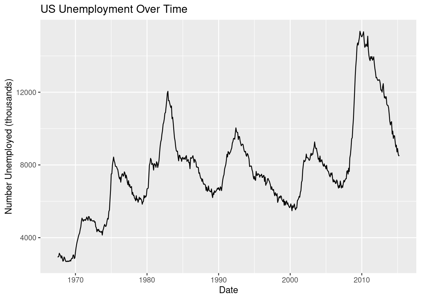 # BASIC: unemployment over timeggplot(economics, aes(x = date, y = unemploy)) +geom_line() +labs(title ="US Unemployment Over Time",x ="Date", y ="Number Unemployed (thousands)")