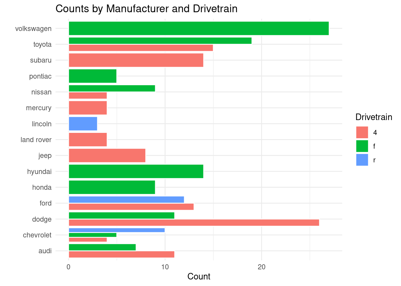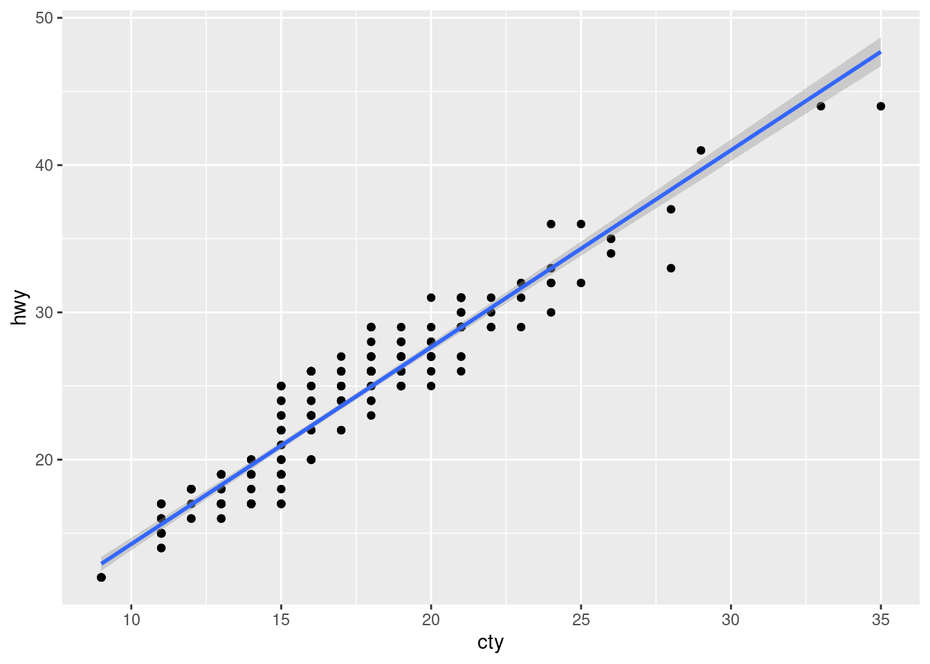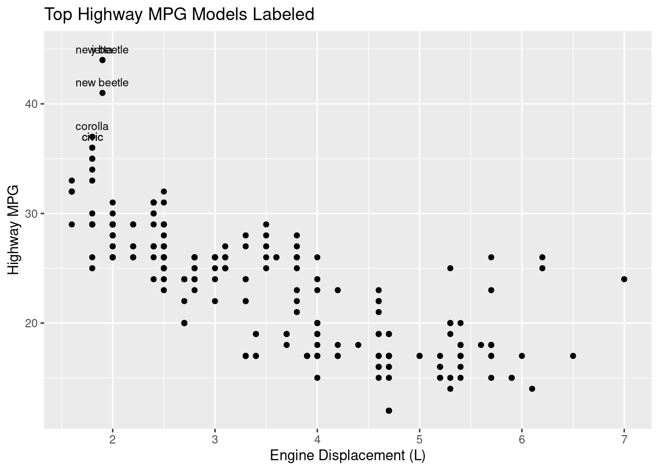 The code above first identifies the top three hwy values using slice_max(), pairs that with geom_text() and labels only the extreme data points. Now, viewers can read from the plot which model of cars have the best highway miles per gallon.