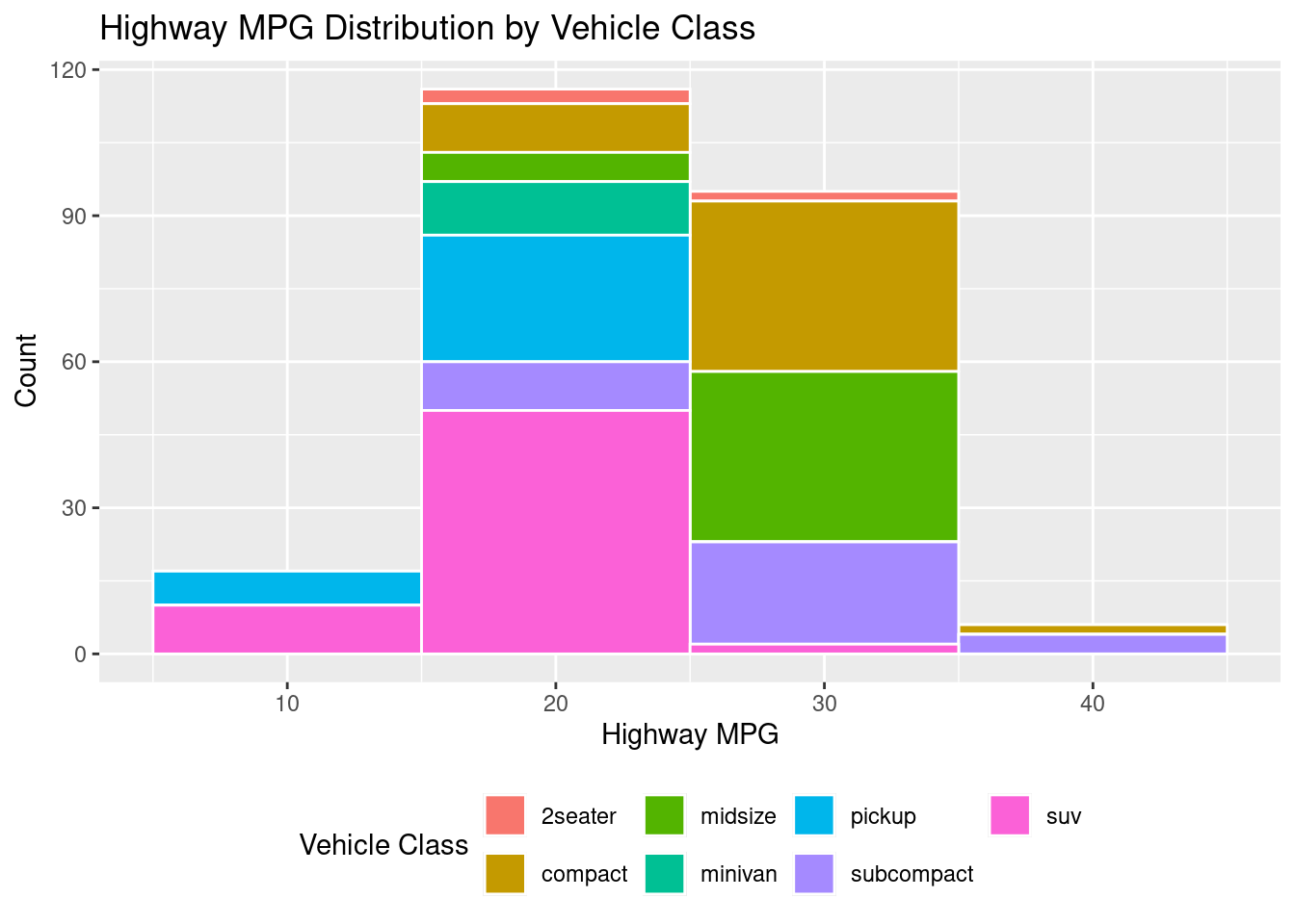 # MAPPED FILL (stacked by class)ggplot(mpg, aes(hwy, fill = class)) +geom_histogram(binwidth =10, color ="white") +labs(title ="Highway MPG Distribution by Vehicle Class",x ="Highway MPG", y ="Count", fill ="Vehicle Class") +theme(legend.position ="bottom")