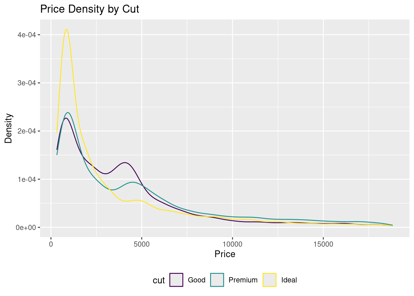 # GROUPEDggplot(diamonds %>%filter(cut %in%c("Good", "Ideal", "Premium")),aes(price, color = cut)) +geom_density() +labs(title ="Price Density by Cut", x ="Price", y ="Density") +theme(legend.position ="bottom")