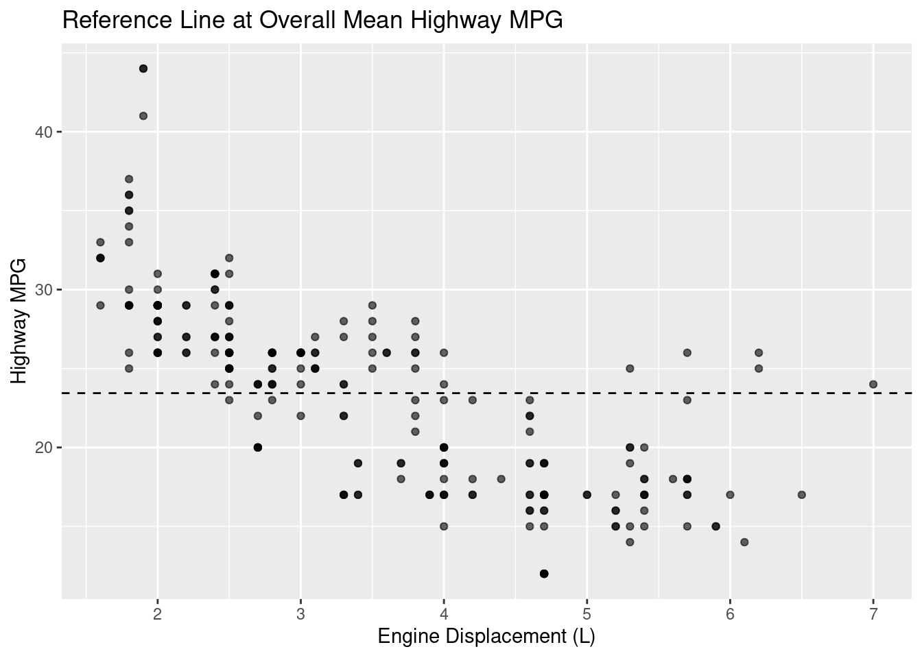 # Horizontal line at overall meanoverall_mean <-mean(mpg$hwy, na.rm =TRUE)ggplot(mpg, aes(displ, hwy)) +geom_point(alpha =0.6) +geom_hline(yintercept = overall_mean, linetype ="dashed") +labs(title ="Reference Line at Overall Mean Highway MPG",x ="Engine Displacement (L)", y ="Highway MPG")