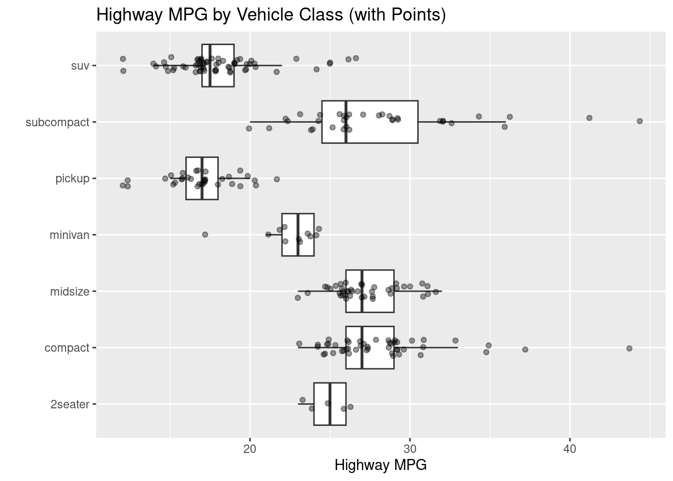 # WITH JITTERED POINTS OVERLAIDggplot(mpg, aes(class, hwy)) +geom_boxplot(outlier.shape =NA) +geom_jitter(width =0.15, alpha =0.4, size =1.5) +coord_flip() +labs(title ="Highway MPG by Vehicle Class (with Points)",x ="", y ="Highway MPG")