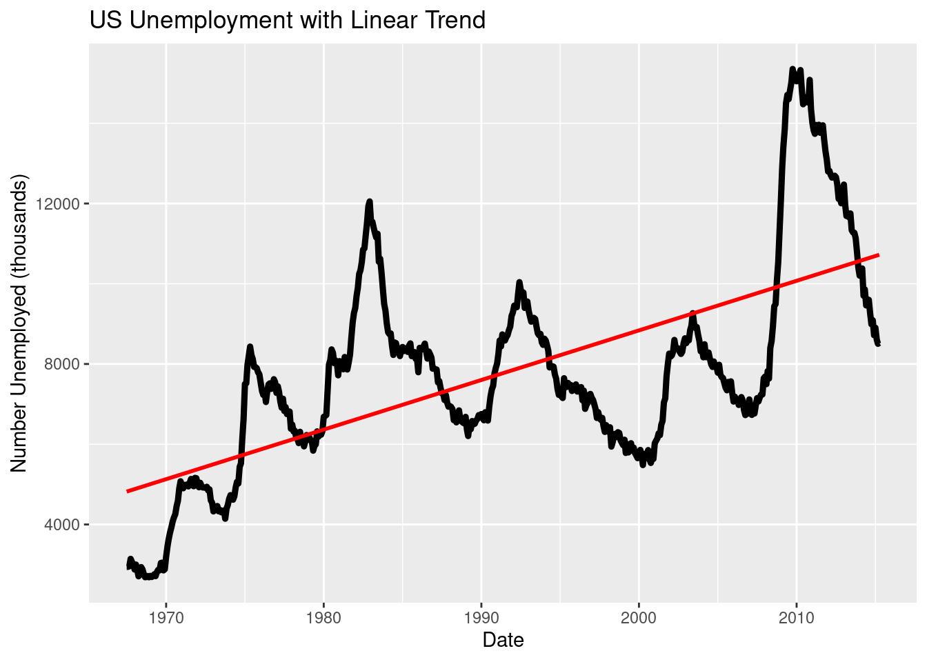 # PLUS: LM vs LOESS contrastggplot(economics, aes(date, unemploy)) +geom_line(linewidth =1.6) +geom_smooth(method ="lm", se =FALSE, color ="red") +labs(title ="US Unemployment with Linear Trend",x ="Date", y ="Number Unemployed (thousands)")