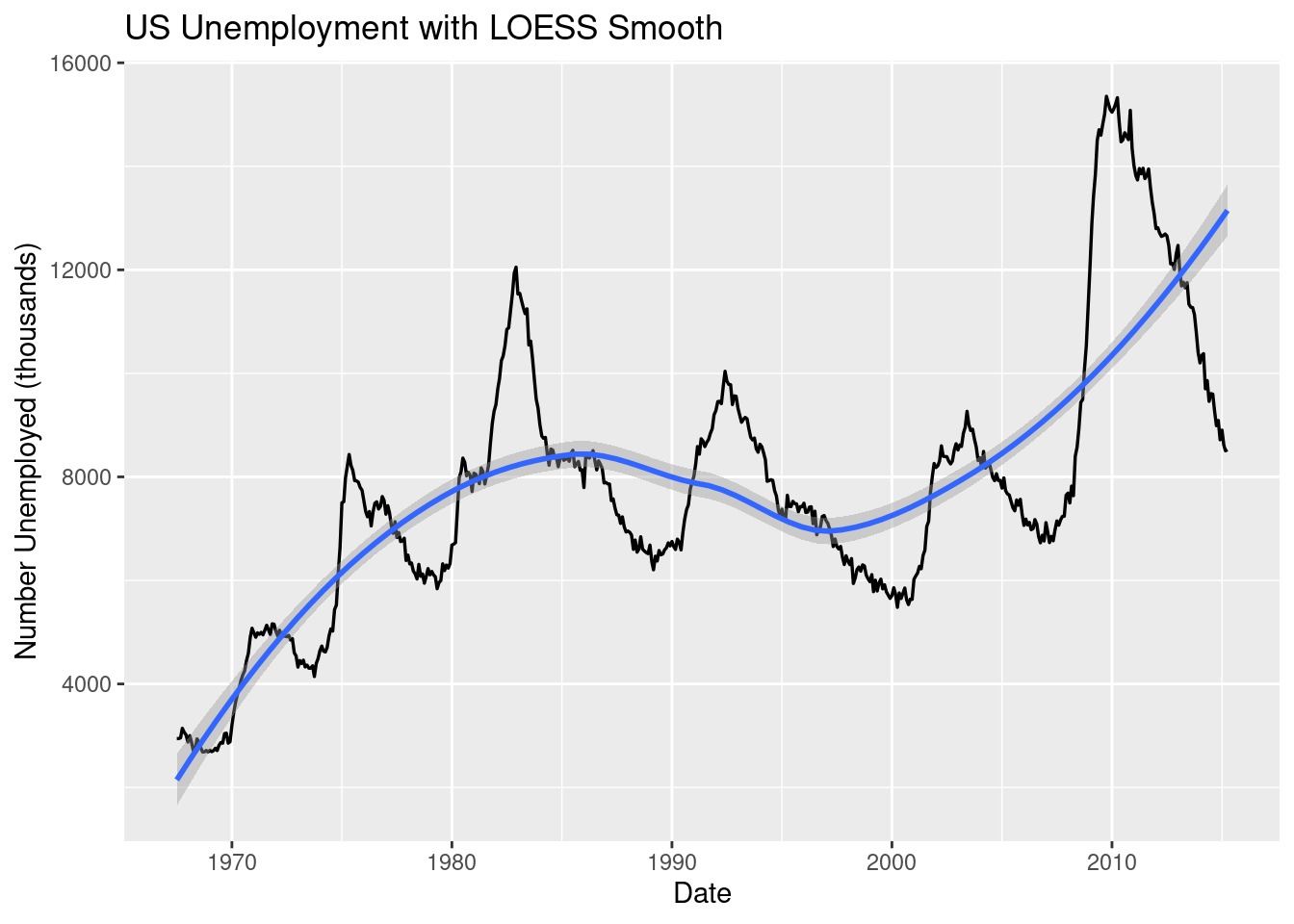 ggplot(economics, aes(date, unemploy)) +geom_line(linewidth =0.6) +geom_smooth(method ="loess", se =TRUE) +# loess = flexible smoothing; se = confidence bandlabs(title ="US Unemployment with LOESS Smooth",x ="Date", y ="Number Unemployed (thousands)")