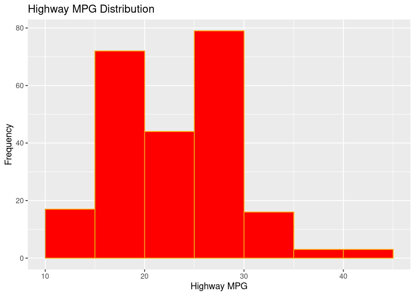 # STYLED (bin edges + colors)ggplot(mpg, aes(hwy)) +geom_histogram(binwidth =5, boundary =0,fill ="red", color ="orange") +labs(title ="Highway MPG Distribution", x ="Highway MPG", y ="Frequency")