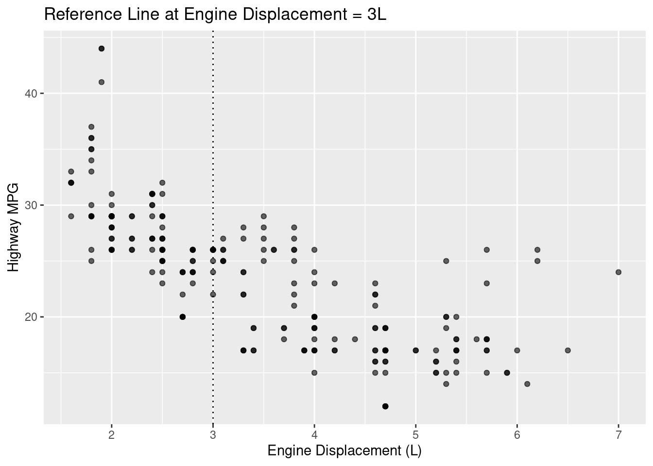 # Vertical line at displ = 3ggplot(mpg, aes(displ, hwy)) +geom_point(alpha =0.6) +geom_vline(xintercept =3, linetype ="dotted") +labs(title ="Reference Line at Engine Displacement = 3L",x ="Engine Displacement (L)", y ="Highway MPG")