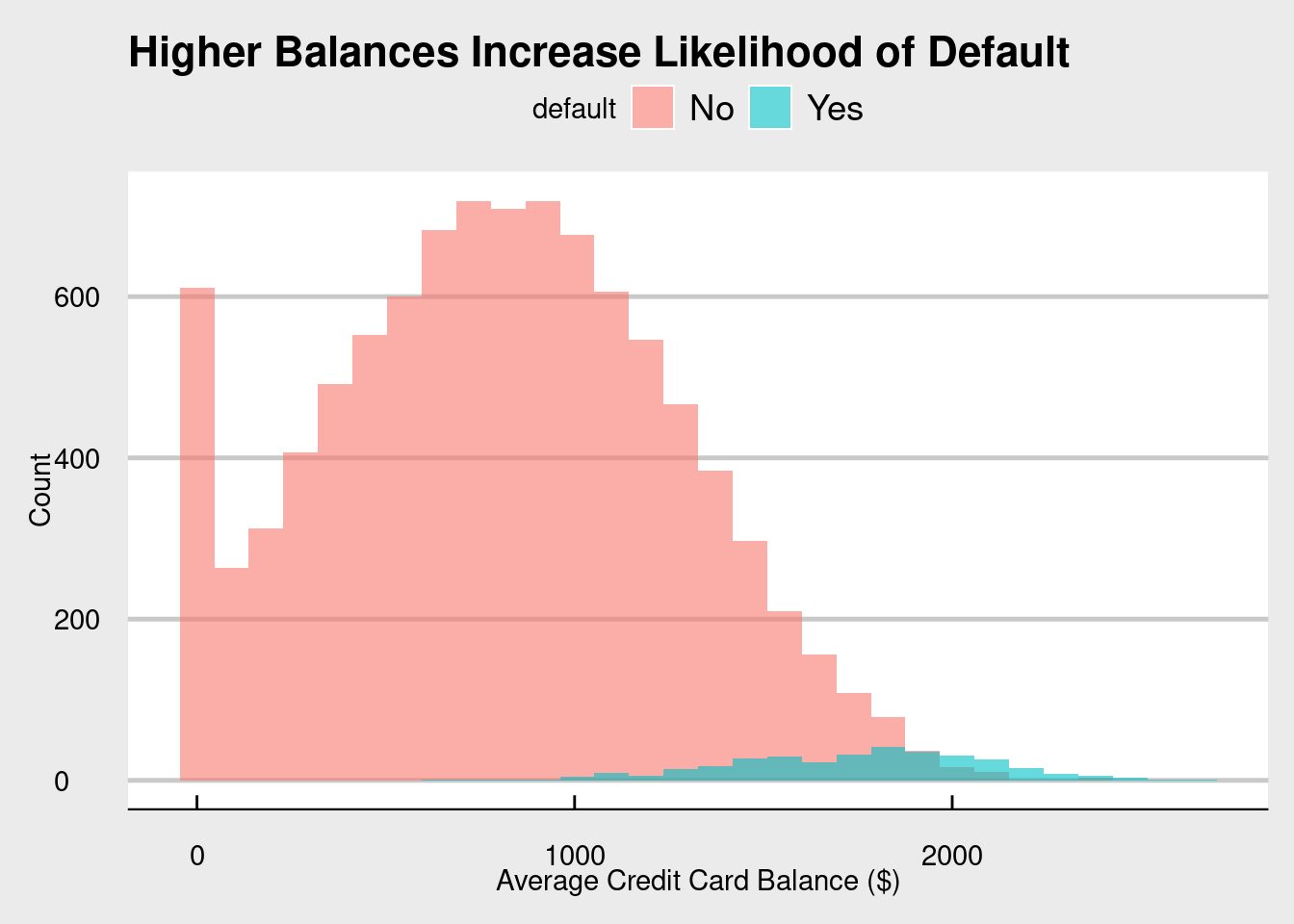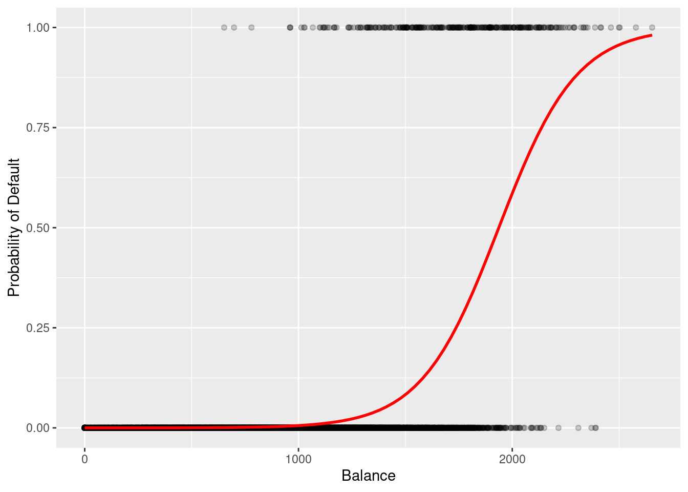 As balance increases, the odds of default rise sharply.