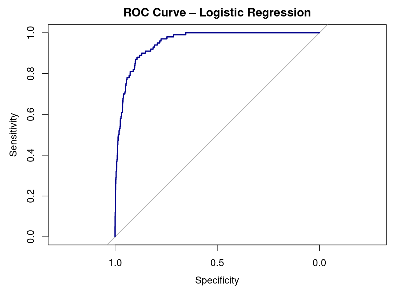 Receiver Operating Characteristic (ROC) curve for the logistic regression model predicting credit card default. The curve plots sensitivity against 1 − specificity across all possible classification thresholds. Curves closer to the top-left corner indicate better classification performance. The area under the curve (AUC) summarizes the model’s ability to distinguish between defaulters and non-defaulters.